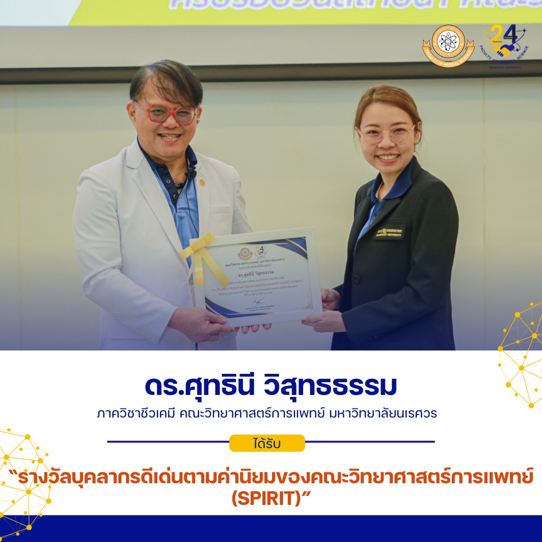 Next Next post: คณะวิทยาศาสตร์การแพทย์ มหาวิทยาลัยนเรศวร ขอแสดงความยินดีกับ บุคลากรสายวิชาการ ที่ได้ได้รับทุนอุดหนุนการวิจัย งบประมาณรายได้คณะ ประจำปีงบประมาณ 2569 คณะวิทยาศาสตร์การแพทย์
