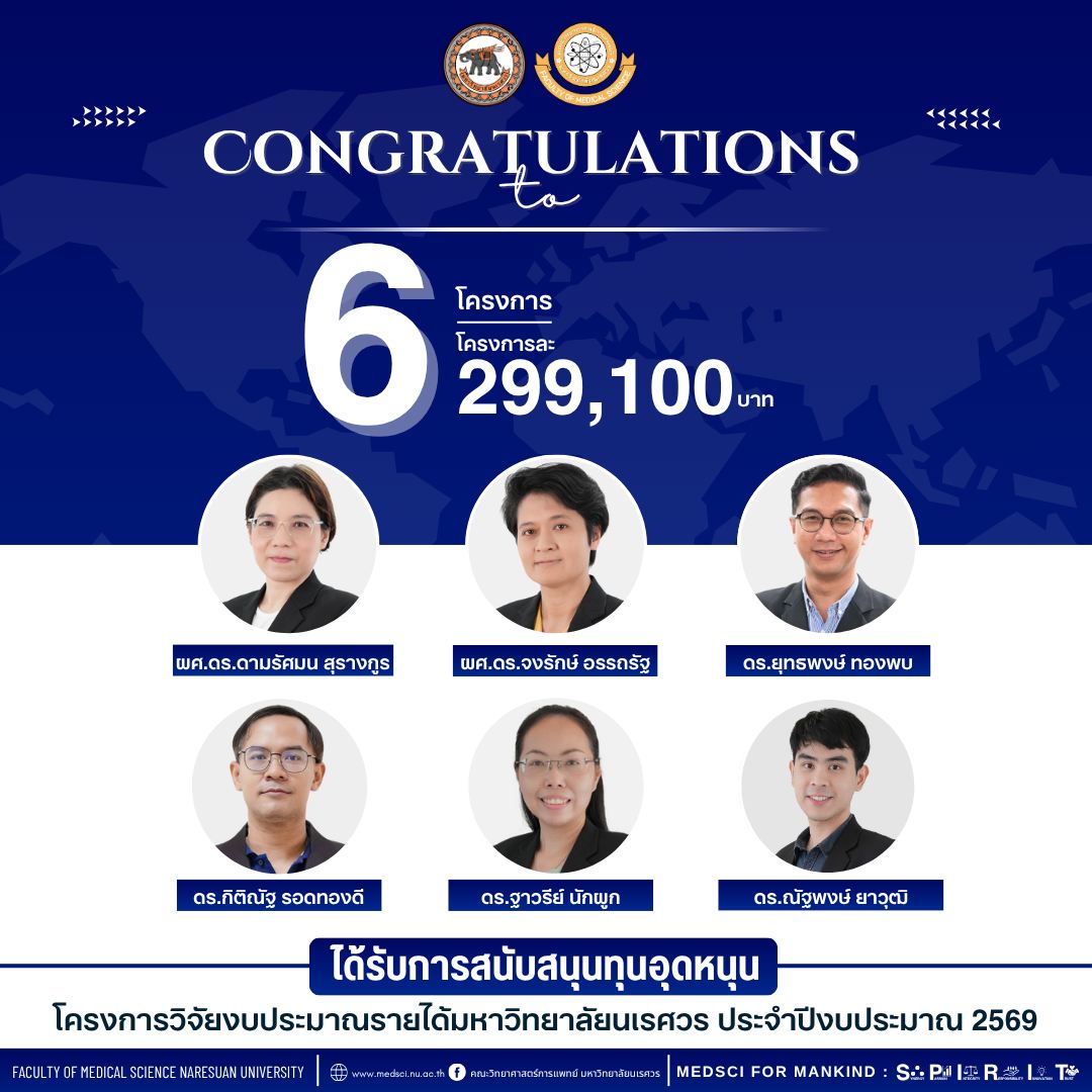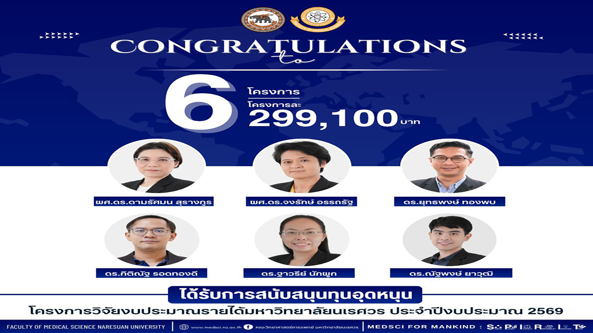 คณะวิทยาศาสตร์การแพทย์ มหาวิทยาลัยนเรศวร ขอแสดงความยินดีกับ บุคลากรสายวิชาการ ที่ได้รับการสนับสนุนทุนอุดหนุนโครงการวิจัยงบประมาณรายได้มหาวิทยาลัยนเรศวร ประจำปีงบประมาณ 2569