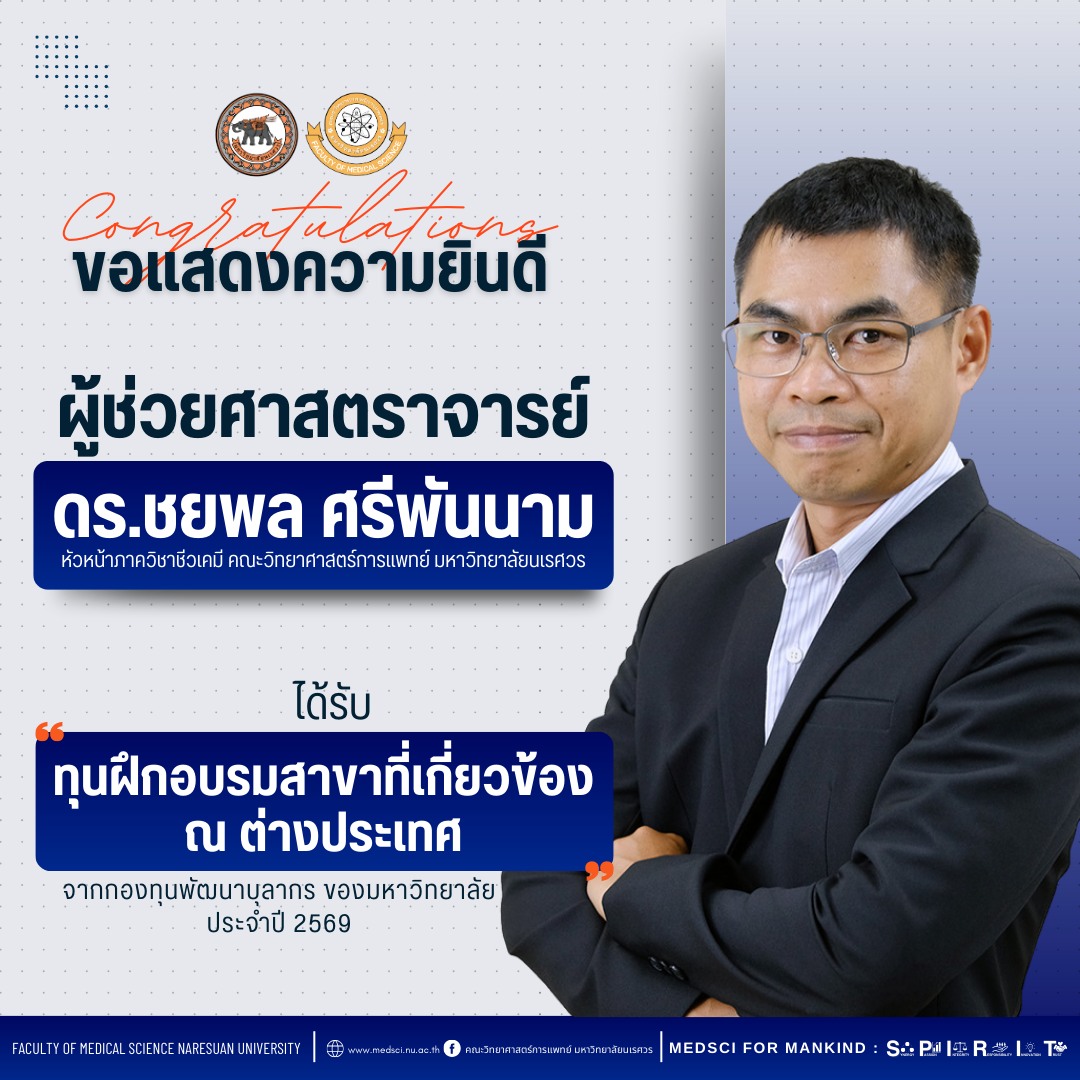 คณะวิทยาศาสตร์การแพทย์ ขอแสดงความยินดีกับ ผู้ช่วยศาสตราจารย์ ดร.ชยพล ศรีพันนาม หัวหน้าภาควิชาชีวเคมี คณะวิทยาศาสตร์การแพทย์ มหาวิทยาลัยนเรศวร